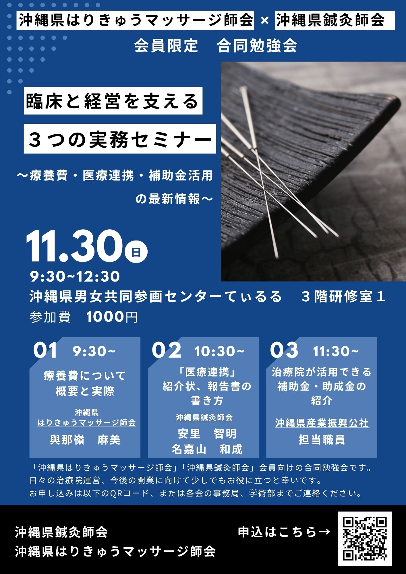 ※以下勉強会は終了しております。(掲載日:2024/07/07) さて、表記につきまして、下記内容で勉強会を開催いたします。当会会長の伊禮先生を講師に迎え、操体法について学ばせて頂く予定です。先生は、鍼灸に操体法を取り入れ、長年に渡り、その研究を重ねられてこられました。今回は、基礎編についてご教授頂きます。これからの臨床の一つの技にしていただければ幸いです。何かとご多用のことは思いますが、お誘い合わせの上、振るってのご出席を心からお待ちしております。           ◆お問合せ先 瑞海鍼灸院 (担当:福里)までお問合せください。 ℡  098-886-5571  蝉の声に暑さを覚え、一雨欲しい今日このごろ、先生方には、お元気でお過ごしでしょうか。日頃は当会活動にご支援、ご協力を賜り、心から御礼申し上げます。              記◆日時 2024年7月21日(日)  10 時~12 時半 (受付 9 時 30 分、閉会 13 時。)◆ テーマ 操体法。~体の歪を直して治癒効果を上げる~ ◆講師 いれいはりきゅう院 院長 伊禮隆一先生(沖縄県鍼灸師会会長)◆会場 沖縄県男女共同参画センター【てぃるる】 (〒900-0036 沖縄県那覇市西 3-11-1)◆参加費 ①沖鍼会・会員 = 1,000 円 ②学生 = 1,000 円   ②非会員 = 5,000 円◆お問合せ先 瑞海鍼灸院 (担当:福里)までお問合せください。 ℡  098-886-5571